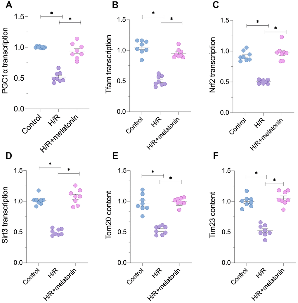 Figure 1. Melatonin treatment restores mitochondrial biogenesis in H/R-treated cardiomyocytes. Cardiomyocytes were subjected to H/R injury, with or without previous melatonin treatment to protect the cardiomyocytes. (A–D) qPCR assays were used to evaluate the transcription of PGC1α, Tfam, Nrf2 and Sirt3. (E, F) Western blots were used to evaluate the alterations in the mitochondria-related proteins Tom20 and Tim23. *p<0.05.