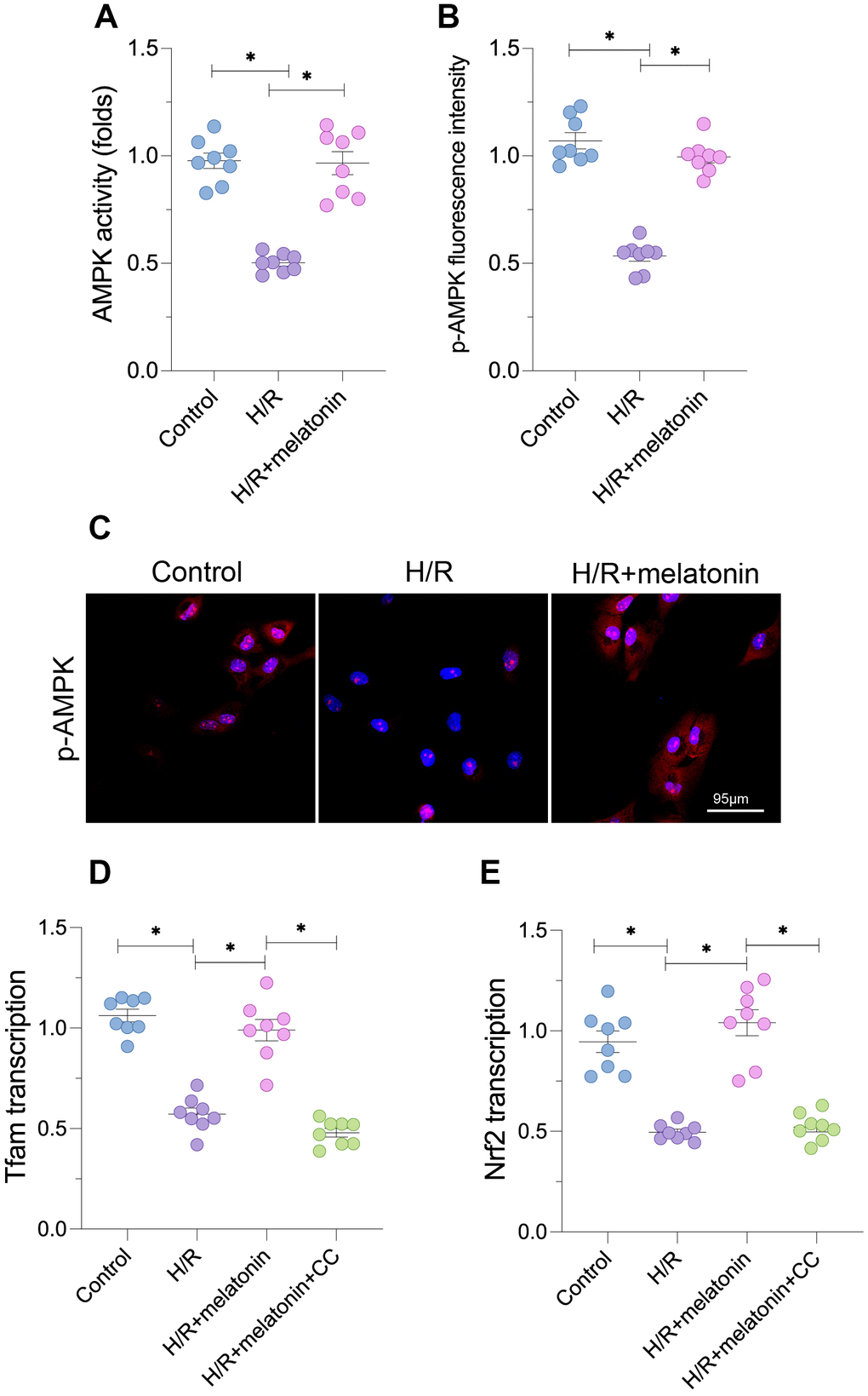 Figure 2. Melatonin activates the AMPK pathway to induce mitochondrial biogenesis. Cardiomyocytes were subjected to H/R injury, with or without previous melatonin treatment to protect the cardiomyocytes. (A) An ELISA was used to evaluate AMPK activity. (B, C) An immunofluorescence assay was used to evaluate the expression of p-AMPK. (D, E) qPCR was used to evaluate the transcription of Tfam and Nrf2. CC was used to inhibit the activity of AMPK. *p<0.05.