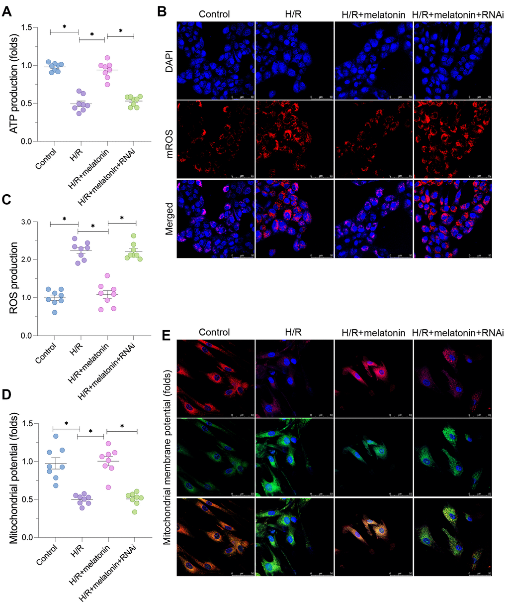 Figure 3. Melatonin preserves mitochondrial function in H/R-treated cardiomyocytes by inducing the AMPK/PGC1α pathway. Cardiomyocytes were subjected to H/R injury, with or without previous melatonin treatment to protect the cardiomyocytes. The cardiomyocytes were transfected with siRNA to knock down PGC1α. (A) An ELISA was used to assess ATP production. (B, C) An immunofluorescence assay was used to measure mitochondrial ROS in cardiomyocytes. (D, E) An immunofluorescence assay was used to measure the mitochondrial membrane potential. *p<0.05.
