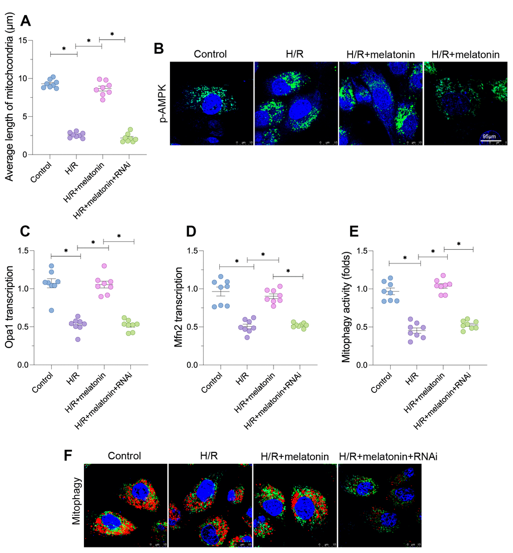 Figure 4. Melatonin alters the mitochondrial morphology in cardiomyocytes by inducing the AMPK/PGC1α pathway. Cardiomyocytes were subjected to H/R injury, with or without previous melatonin treatment to protect the cardiomyocytes. The cardiomyocytes were transfected with siRNA to knock down PGC1α. (A, B) An immunofluorescence assay was used to assess the mitochondrial morphology. (C, D) A qPCR assay was used to evaluate the transcription of Opa1 and Mfn2. (E, F) An mt-kemia assay was used to evaluate mitophagy activity. *p<0.05.
