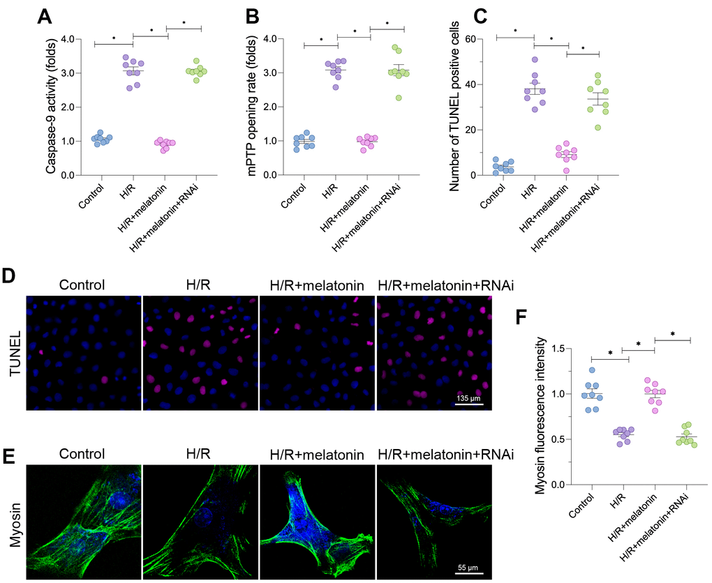 Figure 5. Melatonin-induced mitochondrial biogenesis promotes cardiomyocyte survival. Cardiomyocytes were subjected to H/R injury, with or without previous melatonin treatment to protect the cardiomyocytes. The cardiomyocytes were transfected with siRNA to knock down PGC1α. (A) An ELISA was used to assess caspase-9 activity. (B) The mPTP opening rate was determined in cardiomyocytes. (C, D) TUNEL staining for apoptotic cells in cardiomyocytes. (E, F) An immunofluorescence assay was used to measure the expression of myosin. *p<0.05.