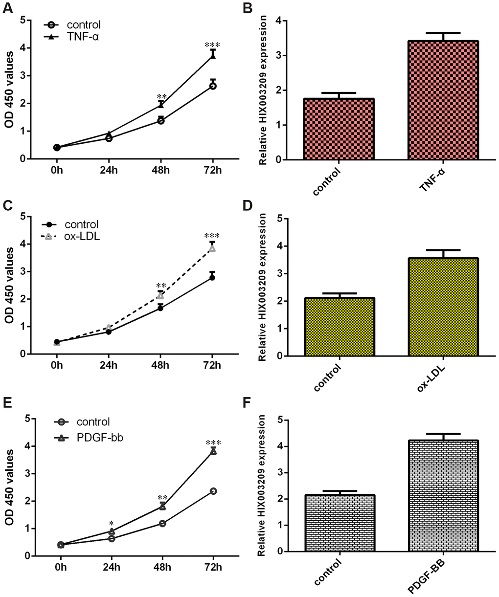 TNF-α significantly promoted VSMC proliferations compared to the control group (Figure 2A). Then, we showed that HIX003209 expression was upregulated in VSMCs induced by TNF-α (Figure 2B). We also confirmed that ox-LDL induced VSMC growth (Figure 2C). The expression of HIX003209 was higher in VSMCs induced by ox-LDL compared to the control group (Figure 2D). As indicated in Figure 2E, PDGF-BB enhanced VSMCs proliferation when compared to the control group (Figure 2E). The expression of HIX003209 was overexpressed in VSMCs induced by PDGF-BB compared to the control group (Figure 2F).
