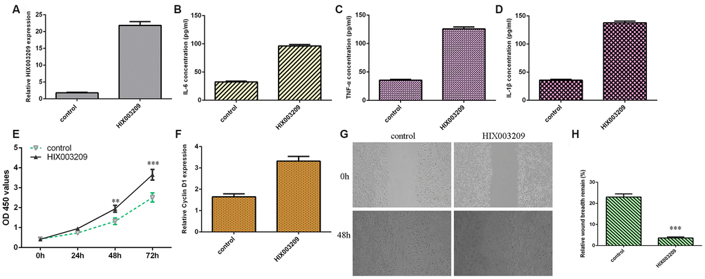 HIX003209 was significantly overexpressed in VSMCs after transfection with pcDNA-HIX003209 (Figure 3A). Ectopic expression of HIX003209 induced the secretion of inflammatory mediators including IL-6 (Figure 3B), TNF-α (Figure 3C) and IL-1β (Figure 3D). Elevated expression of HIX003209 promoted VSMCs proliferation (Figure 3E). The expression of cyclin D1 was upregulated in VSMCs after transfection with pcDNA-HIX003209 (Figure 3F). Overexpression of HIX003209 induced VSMCs migration (Figure 3G) and the relative wound breadth remain of two groups was showed in Figure 3H.