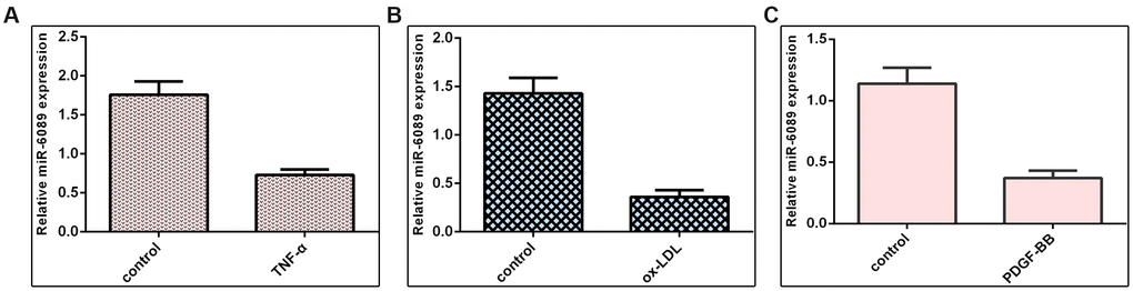 We demonstrated that miR-6089 expression was downregulated in VSMCs induced by TNF-α when compared to the control group (Figure 5A). Ox-LDL can inhibit miR-6089 expression in VSMCs when compared to the control group (Figure 5B). Furthermore, we proved that PDGF-BB decreased the expression of miR-6089 expression in VSMCs when compared to the control group (Figure 5C).