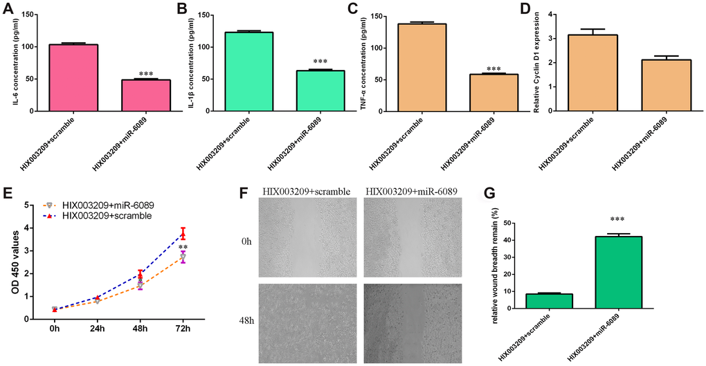Rescue test was carried out to study whether HIX003209 induced the secretion of inflammatory mediators, cell growth and migration via regulating miR-6089 expression. qRT-PCR assay data showed that overexpression of miR-6089 decreased inflammatory mediators secretion including IL-6 (Figure 7A), TNF-α (Figure 7B) and IL-1β (Figure 7C) in HIX003209-overexpressing VSMCs when compared to the scramble group. In addition, ectopic expression of miR-6089 inhibited cyclin D1 expression in HIX003209-overexpressing VSMCs when compared to the scramble group (Figure 7D). Elevated expression of miR-6089 suppressed cell proliferation in HIX003209-overexpressing VSMCs when compared to the scramble group (Figure 7E). Furthermore, we indicated that miR-6089 overexpression inhibited HIX003209-overexpressing VSMCs migration (Figure 7F) and the relative wound breadth remain was showed in Figure 7G.