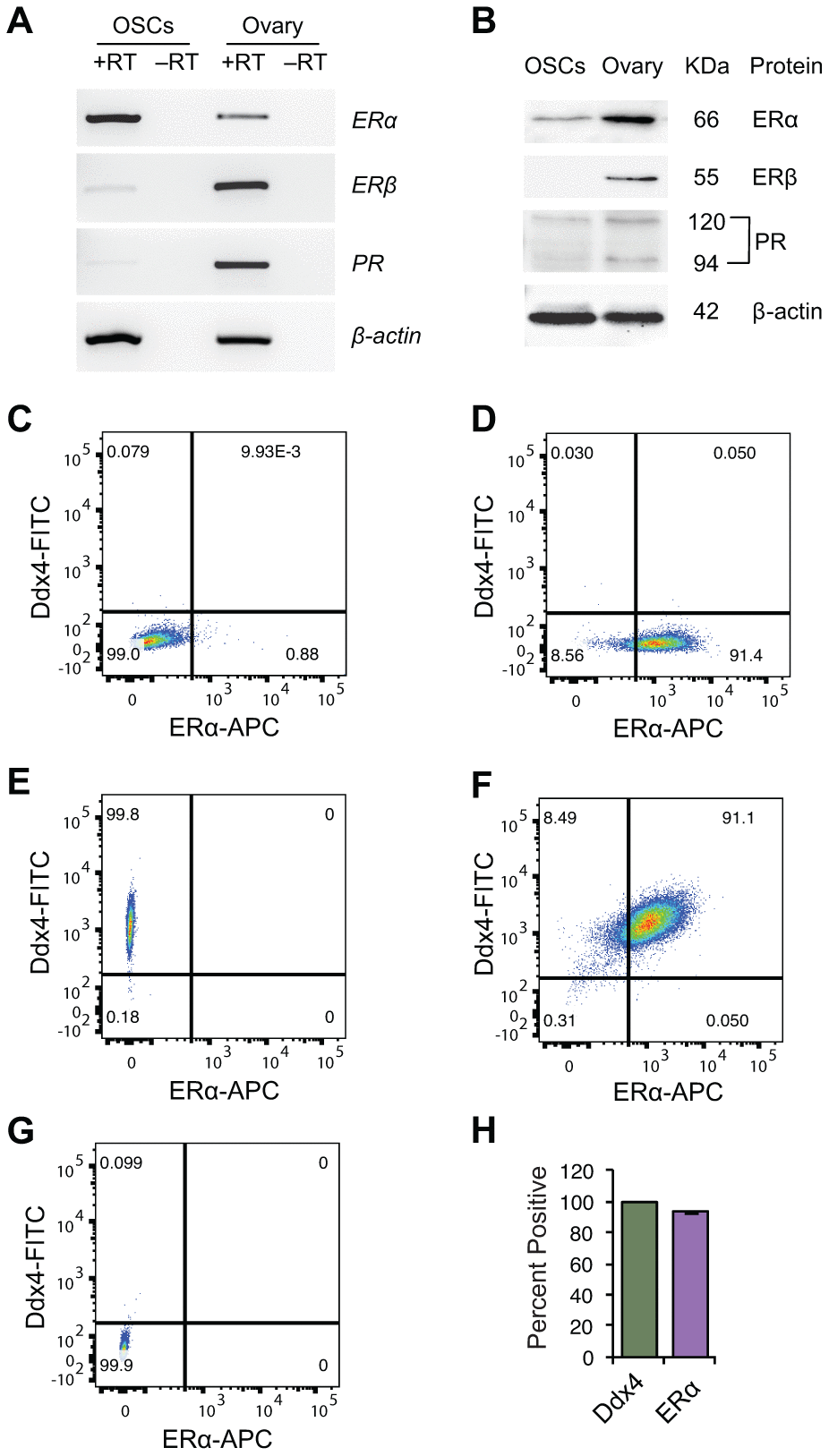 Using reverse transcription (RT)-polymerase chain reaction (PCR) and western blot analyses, we identified the presence of estrogen receptor-α (ERα) mRNA (Figure 1A) and ERα protein (Figure 1B), respectively, in OSCs. We also detected mRNAs encoding ERβ and PR in OSCs, but levels of these transcripts were more difficult to visualize compared with ERα mRNA (Figure 1A). By western blot analysis, we detected PR protein, but not ERβ protein, in OSCs (Figure 1B). Flow cytometric analysis of OSCs for co-expression of ERα and the germ cell marker, DEAD-box polypeptide 4 (Ddx4; also referred to mouse vasa homologue or Mvh), showed that over 93% of the germ cells sorted and identified as OSCs by externalized Ddx4 expression [22, 24, 29, 38, 50, 52, 53] were also ERα-positive (Figures 1C–1H).