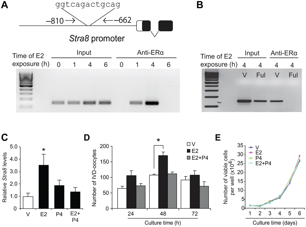 To test for potential interactions of E2-activated ERα with meiotic regulatory pathways in OSCs, we next used chromatin immunoprecipitation (ChIP)-PCR assays to assess the Stra8 promoter, which is one of the most well-defined genes in germ cell meiotic commitment [58–63]. In E2-exposed OSCs, we found that ERα occupied a consensus ER response element (ERE) in the Stra8 promoter (Figure 2A). As a specificity control, OSCs pretreated with the pure ER antagonist, fulvestrant [68], failed to exhibit ERα interaction with the Stra8 promoter after E2 treatment (Figure 2B). In keeping with these findings, culture of OSCs with E2 significantly increased both Stra8 mRNA levels (Figure 2C) and in vitro-derived (IVD)–oocyte formation (Figure 2D), the latter serving as an established bioassay for oogenesis [24, 29, 37, 50]. While P4 treatment alone had no effect on Stra8 expression or in-vitro oocyte formation, the stimulatory actions of E2 on both Stra8 expression (Figure 2C) and oogenesis (Figure 2D) were nullified by the presence of P4. Notably, proliferation of OSCs was unaffected by treatment with either steroid alone or with a combination of the two steroids together (Figure 2E).