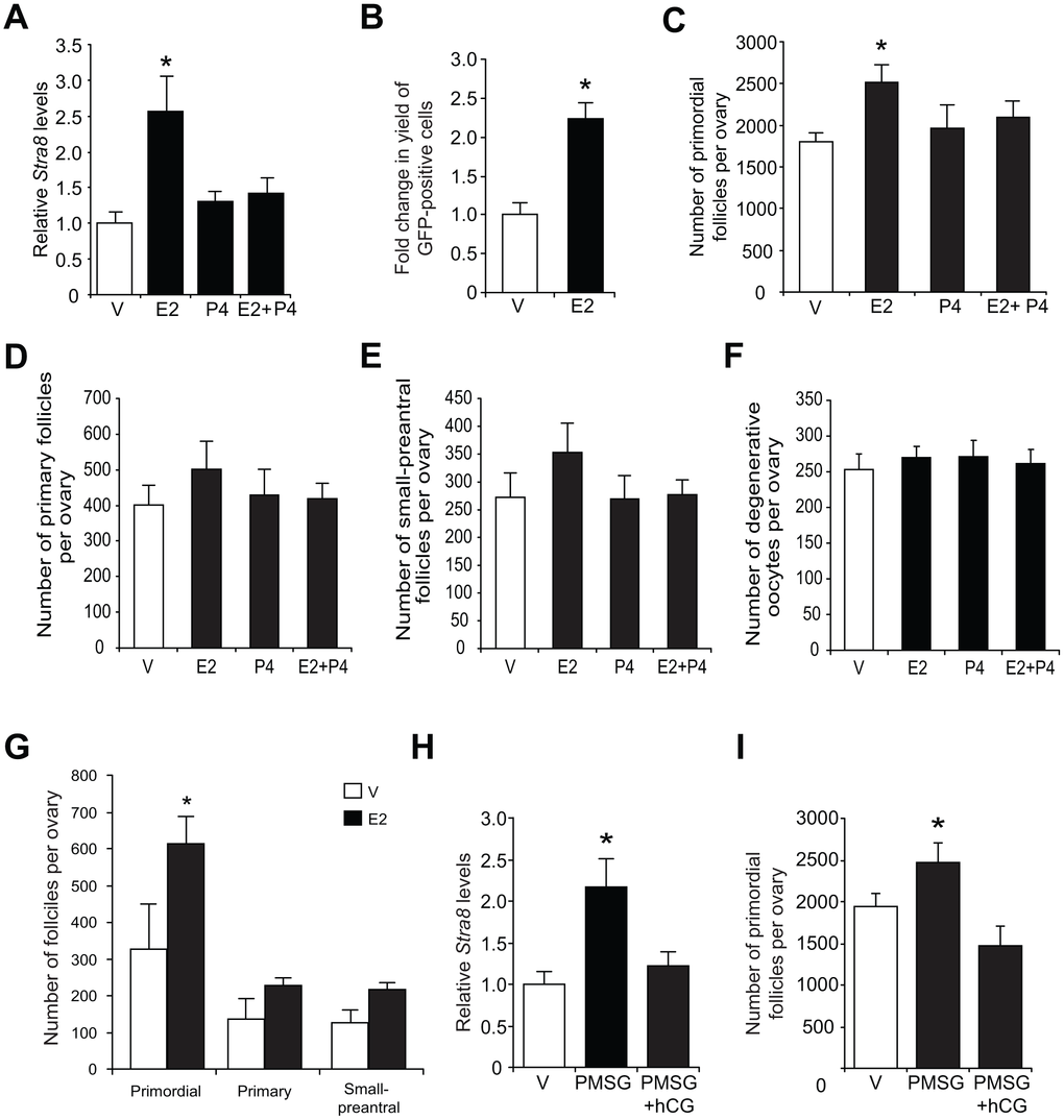 To test if an elevation in endogenous E2 levels could reproduce the effects of exogenous E2 injection on oogenesis in vivo, we injected adult mice with pregnant mare serum gonadotropin (PMSG) to hyperstimulate ovarian follicle maturation and E2 secretion. Ovarian Stra8 expression and primordial follicle numbers were significantly increased 48 hours after PMSG injection (Figures 3H and 3I). A subsequent injection of human chorionic gonadotropin (hCG), which triggers ovulation of PMSG-ripened follicles leading to the formation of P4-producing corpora lutea, resulted in a reduction in both Stra8 expression and oocyte numbers to or below those levels observed prior to PMSG injection (Figure 3H and 3I). These outcomes reinforce the data obtained from studies of purified OSCs cultured with steroids in vitro (Figures 2C and 2D), and of mice injected with exogenous steroids in vivo (Figures 3A and 3C), collectively supporting the conclusion that P4 opposes the stimulatory actions of E2 on adult oogenesis.