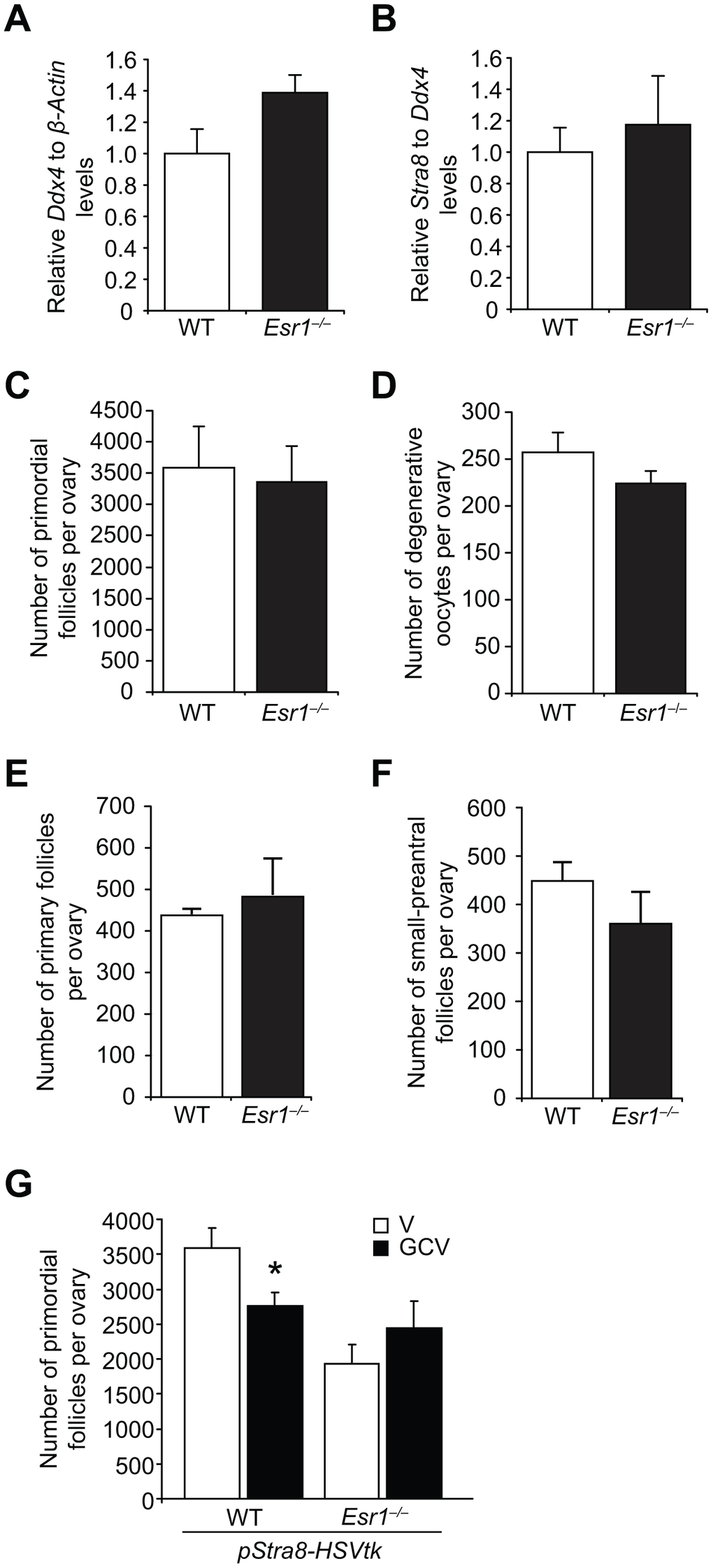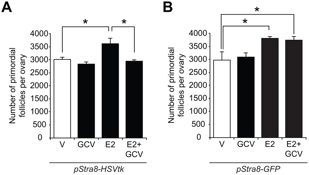 To determine the in-vivo relationship, if any, of E2-induced Stra8 expression to changes in oogenesis, we examined the impact of temporally ablating Stra8-expressing germ cells in the absence or presence of exogenous E2 on oocyte numbers using a Stra8 promoter-driven suicide gene transgenic mouse line (pStra8-HSVtk) [29]. This model enables targeted disruption of germ cells undergoing meiotic commitment associated with transcriptional activation of the Stra8 gene, without directly affecting either OSCs (‘pre-Stra8’) or existing oocytes (‘post-Stra8’). Short-term treatment with the herpes simplex virus thymidine kinase (HSVtk) pro-drug, ganciclovir (GCV), did not affect primordial follicle numbers in adult pStra8-HSVtk mice over a 7-day period, consistent with past studies [29]; however, the oogenic response to exogenous E2 stimulation was completely abolished in pStra8-HSVtk mice pretreated with GCV for 7 days prior to E2 injection (Figure 4A). Specificity of this outcome was verified using adult pStra8-GFP mice as negative controls, in which GCV pretreatment for 7 days had no effect on E2-driven increases in primordial follicle numbers (Figure 4B). These data further support that E2 increases oocyte numbers through a pathway involving Stra8 activation.