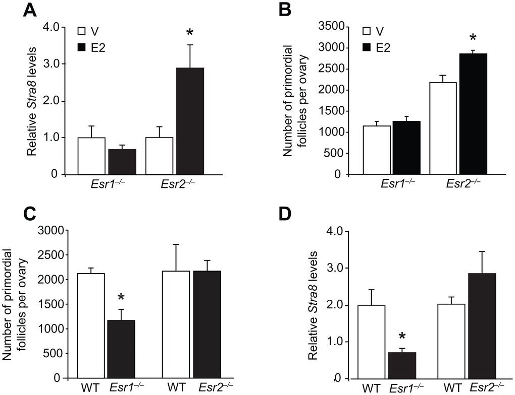 Since OSCs express ERα (Figures 1A–1G), this may indicate an important role exists for this ER isoform in regulating OSC differentiation in response to E2. In agreement with this, we found that adult gene-mutant mice lacking ERα (Esr1-null, Esr1–/–), but not those lacking ERβ (Esr2–/–), failed to respond to exogenous E2 treatment with an elevation in either ovarian Stra8 expression (Figure 5A) or oocyte numbers (Figure 5B). In addition, primordial follicle numbers in vehicle-treated Esr1–/– mice were lower than those of vehicle-treated Esr2–/– mice at the same ages (Figure 5B), indicating that ERα deficiency may be a critical regulator of oogenesis under physiological conditions. In agreement with this, by 2 months of age Esr1–/– mice had developed a premature ovarian insufficiency (POI) phenotype of significantly fewer oocytes when compared with their wild type (WT) female littermates (Figure 5C), along with reduced levels of ovarian Stra8 expression (Figure 5D). No differences were detected in the numbers of primordial follicles or ovarian Stra8 expression in age-matched adult WT versus Esr2–/– mice (Figures 5C and 5D).
