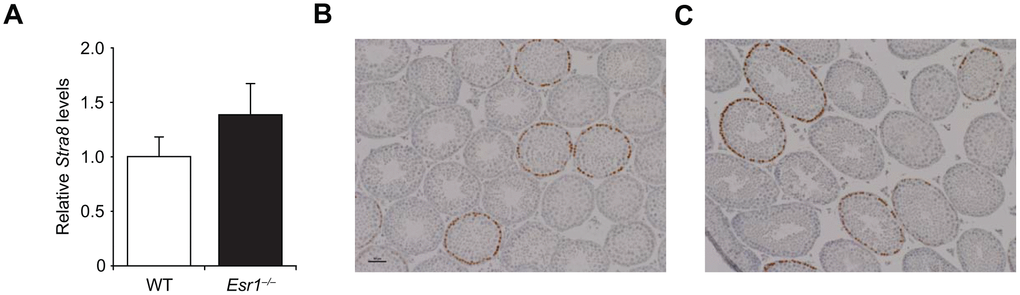 Freshly collected tissues were fixed in 4% paraformaldehyde, embedded in paraffin, and sectioned for analysis using a rabbit polyclonal antibody against Stra8 (ab49602, Abcam). Detection was performed using biotin-conjugated anti-rabbit IgG as secondary antibody for streptavidin-horseradish peroxidase–based 3,3’-diaminobenzidine detection (MilliporeSigma). Images were captured using a Nikon ECLIPSE TE2000-S microscope.