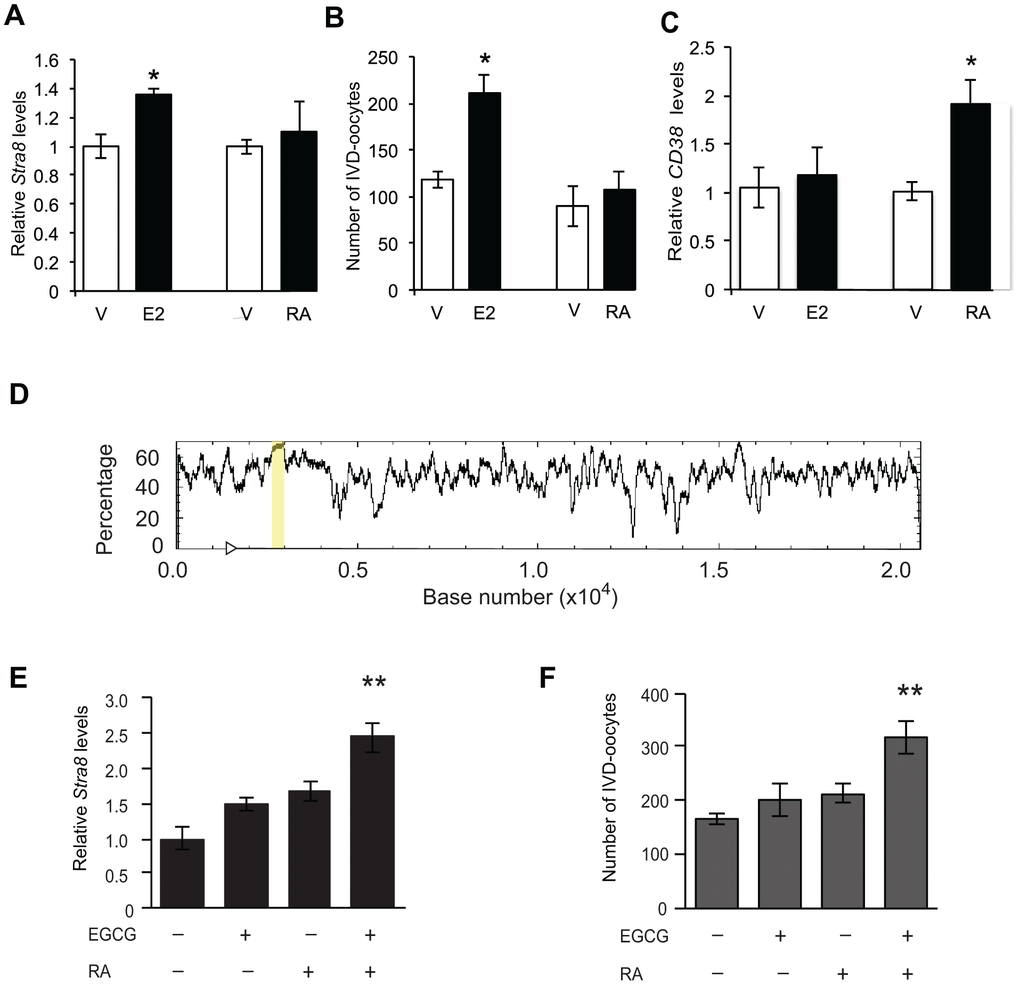 To gain initial insights into a potential mechanism underlying this change in the control of Stra8 expression in female germ cells from embryonic to postnatal life, we directed our attention to epigenetics. This seemed logical given that OSCs failed to increase Stra8 expression when exposed to RA, but exhibited RA responsiveness if expression of a different RA-target gene (CD38) was evaluated in the same cell population. Additionally, earlier studies have implicated epigenetic status as a key regulator of Stra8 expression and germ cell meiotic commitment in mammalian ovaries [67]. Through in-silico analysis, we identified a 386-bp CpG island within the first intron of the Stra8 gene (Figure 8D), suggesting that DNA methylation may play a role in regulating sensitivity of Stra8 to different transcriptional activators. In keeping with this, pretreatment of OSCs with the DNA (cytosine-5)-methyltransferase 1 (Dnmt1) inhibitor, epigallocatechin-3-gallate (EGCG) [71], for 4 hours prior to the addition of RA resulted in enhanced Stra8 expression and IVD-oocyte formation in RA-treated OSC cultures (Figure 8E and 8F).