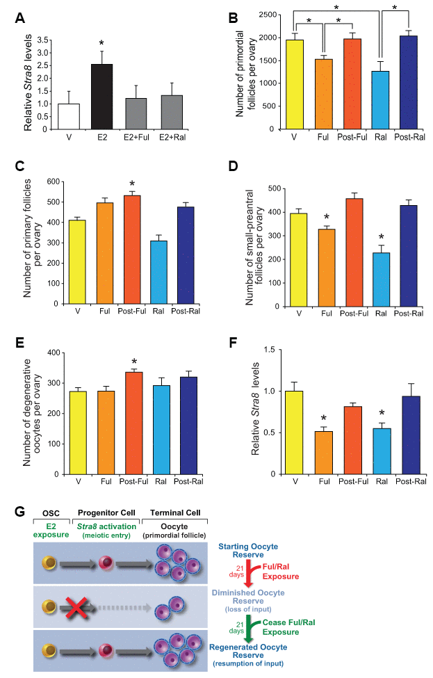 To reinforce our genetic studies on the role of E2-initiated signaling in postnatal oogenesis, in a final set of experiments we tested the effects of two widely used, reversible ER modulators on Stra8 expression and oocyte numbers. While fulvestrant is considered a pure ER antagonist that works by promoting ER degradation [68], raloxifene can have either ER agonistic or antagonistic activity depending on the target tissue or cell type [72]. In cultured OSCs, fulvestrant and raloxifene efficiently inhibited E2-induced Stra8 expression (Figure 9A), indicating that both drugs work directly on OSCs to antagonize ER-mediated signaling. In vivo, adult mice treated for 21 days with either fulvestrant or raloxifene exhibited a significantly diminished primordial oocyte (follicle) pool (Figure 9B), which could not be attributed to accelerated growth activation to more advanced follicle stages or to increased loss through atresia (Figures 9C–9E). After ceasing drug treatment, the primordial follicle pool spontaneously regenerated over a subsequent 21-day period back to the size observed prior to the initiation of drug exposure (Figure 9B). Changes in oocyte numbers in response to ER antagonist exposure (reduced) and removal (regenerated) were paralleled by similar changes in ovarian Stra8 expression (Figure 9F). These data, indicative of a resumption of E2-driven oogenesis to replenish the depleted follicle pool once antagonism of ER signaling was removed (Figure 9G), mirror the reversible oogenic failure reported to occur in a genetic mouse model of targeted and reversible premeiotic germ cell ablation [29].