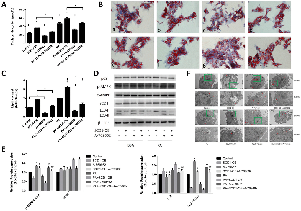 To further determine whether the AMPK signaling pathway is responsible for the regulation of lipophagic activity by SCD1 in sodium palmitate-treated hepatocytes, we treated hepatocytes with SCD1-OE, A-769662 (a selective AMPK activator) and sodium palmitate as single agents or in combination. As shown in Figure 5A–5C, lipid droplet accumulation and intracellular TG levels were decreased in the PA+A-769662 group compared with those in the PA group and in the PA+SCD1-OE+A-769662 group compared with those in the PA+SCD1-OE group (P < 0.05). Treatment of hepatocytes with A-769662 increased the phosphorylation of AMPK (Figure 5D, 5E). The expression of SCD1 in the PA+A-769662 group did not change significantly compared with that in the PA group. The conversion of LC3-I to LC3-II was increased in the PA+SCD1-OE+A-769662 group compared with that in the PA+SCD1-OE group but was decreased compared to that in the PA+A-769662 group. The opposite pattern was observed for the expression of p62. We further measured the number of autophagosomes and other autophagic vacuoles in hepatocytes using TEM. As shown in Figure 5F, SCD1-OE led to a decrease in the number of autophagosomes and autolysosomes in hepatocytes. Conversely, activation of AMPK obviously increased the number of autophagosomes and autolysosomes in hepatocytes treated with SCD1-OE. Taken together, these data show that lipophagy was impaired by sodium palmitate via SCD1-mediated suppression of the AMPK signaling pathway in hepatocytes.
