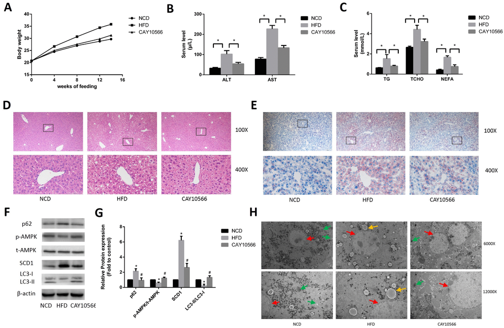 To determine the effect of SCD1 on hepatic steatosis and activation of AMPK and lipophagy in a mouse model of NAFLD, C57BL/6 mice were fed a HFD for 14 weeks and treated or not treated with CAY10566, a specific SCD1 inhibitor. As shown in Figure 6A, the body weights of CAY10566-treated mice were significantly decreased compared to those of HFD-fed mice. In addition, the serum levels of ALT, AST, TG, TCHO and NEFA were significantly higher in the HFD group than in the NCD group, but significantly lower in the CAY10566 group than in the HFD group (Figure 6B, 6C). H&E staining showed that HFD-fed mice developed typical hepatocellular ballooning and inflammatory infiltration (Figure 6D). In addition, Oil Red O staining showed an abundance of lipid droplets in the livers of HFD-fed mice but not control mice (Figure 6E). However, compared to HFD-fed mice, CAY10566-treated mice exhibited significantly ameliorated hepatic steatosis and decreased hepatic lipid droplet accumulation (Figure 6D, 6E).