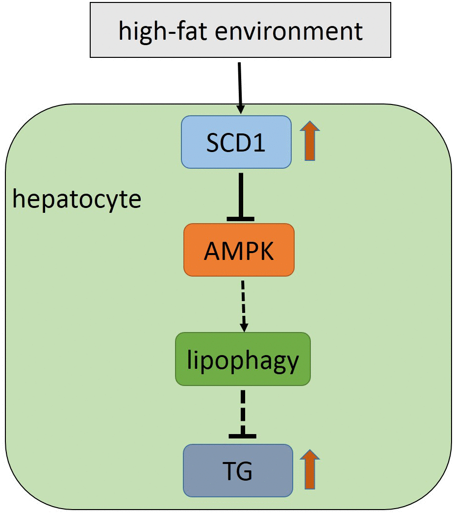According to the classical theory of NAFLD pathogenesis, the multiple-hit theory, aberrant accumulation of TGs in the liver is the basis for the occurrence and development of NAFLD [22, 23]. In general, the causes of abnormal lipid deposition in hepatocytes can be condensed into the following three aspects: lipid entry into the liver is increased, de novo cellular lipid synthesis is enhanced, and lipid mobilization is reduced. SCD1 is a key rate-limiting enzyme in lipid metabolism and is involved in both lipid synthesis and mobilization. In addition, lipophagy plays a role in lipid mobilization and is a new approach to regulate lipid metabolism. AMPK is involved in the control of lipid metabolism by regulating the formation of autophagosomes during autophagy. However, our results revealed a correlation of above three genes in NAFLD, that the novel function of SCD1 in the regulation of lipophagy via AMPK signaling (Figure 7).