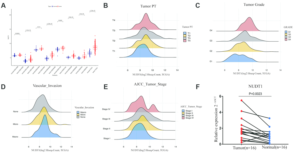 Figure 1. NUDT1 is overexpressed in HCC tissues. (A) NUDT1 mRNA levels in HCC and normal liver tissues in TCGA and GEO datasets. Note: TCGA dataset (tumor = 370; normal = 50); GSE14323 (tumor = 55; normal = 60); GSE14520 (tumor = 225; normal = 220); GSE41804 (tumor = 20; normal = 20); GSE45436, (tumor = 93; normal = 41); GSE51401 (tumor = 30; normal = 34); GSE62232 (tumor = 81; normal = 10); GSE6764 (tumor = 35; normal = 40). (B–E) Density plot shows the relationship between NUDT1 mRNA expression and clinicopathological characteristics, such as, tumor pathology stage (tumor PT), tumor grade, AJCC tumor stage, and degree of vascular invasion. As shown, high NUDT1 mRNA expression is associated with poor prognosis for patients with HCC belonging to stage IV, G4, macrovascular invasion, and T4. (F) Quantitative RT-PCR analysis of NUDT1 mRNA expression in 16 pairs of HCC and adjacent normal liver tissues is shown. NUDT1 is overexpressed in HCC tissues compared with adjacent normal liver tissues (ANLTs; P < 0.01).