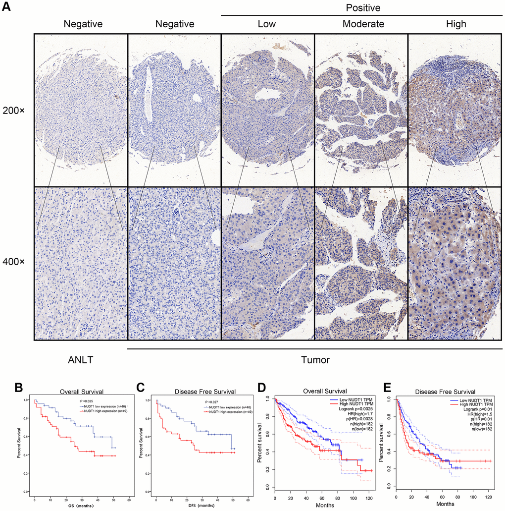 Figure 2. NUDT1 protein is overexpressed in HCC tissues. (A) Representative images show immunohistochemical staining results in 95 pairs of HCC and normal liver tissues samples. Normal liver tissues show negative NUDT1 expression, whereas, HCC tissues show negative or low, moderate, and high NUDT1 protein expression as shown. The scale bars indicate 50μm (200x) and 20 μm (400x). (B, C) Kaplan-Meier survival curves show overall survival (OS) and disease-free survival (DFS) curves for HCC patients with high (n=49) and low (n-46) levels of NUDT1 protein expression. (D, E) Kaplan-Meier survival curves show overall survival (OS) and disease-free survival (DFS) curves for HCC patients from the GEPIA database.