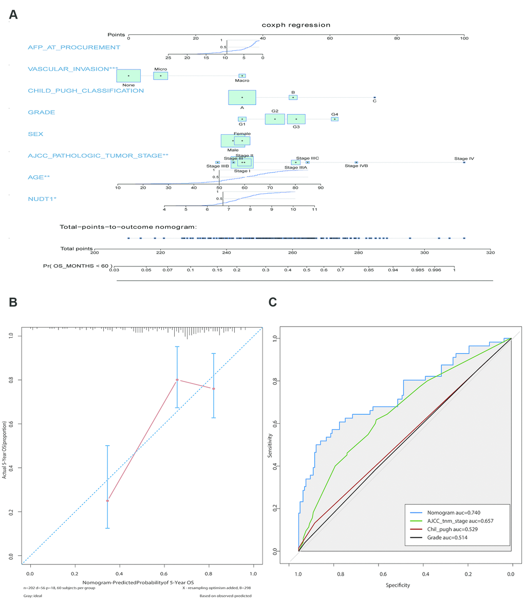 Figure 3. Construction and calibration of the new prognostic nomogram to estimate 5-year survival of HCC patients using NUDT1 as a novel liver-specific variable. (A) Details of the nomogram for predicting survival rates of HCC patients. The corresponding risk score of each clinical variable included in the nomogram is as listed. NUDT1 is the novel liver-specific variable in this nomogram. The C-index of the nomogram was 0.709. (B) The calibration plot shows the differences between true and predicted values of 5-year OS. (C) ROC curve analysis shows the accuracy of the novel prognostic model and other prognostic parameters. The area under curve (AUC) for the prognostic model, AJCC tumor stage, Child-Pugh classification, and tumor grade are 0.740, 0.657, 0.529, and 0.514, respectively. This shows that the prognostic model is more accurate in predicting overall survival by including NUDT1 expression as one of the parameters.