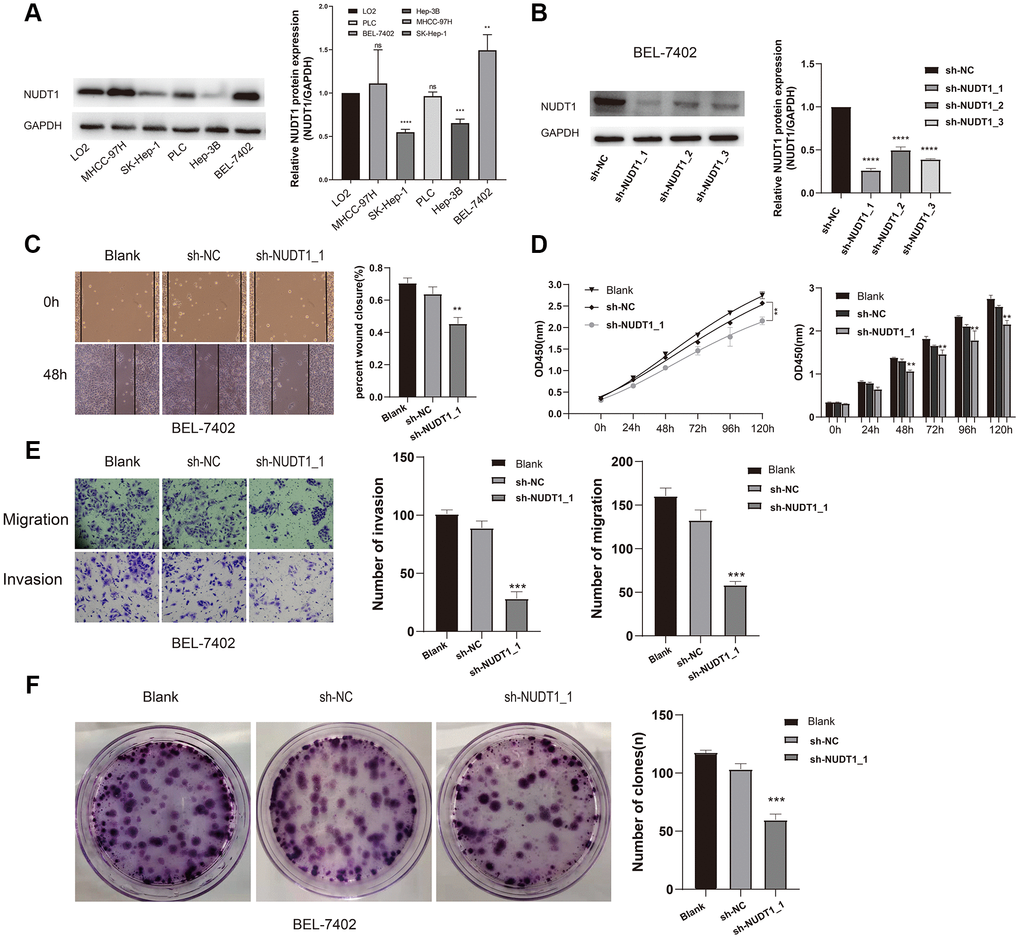 Figure 4. NUDT1 silencing decreases survival, migration, and invasion of HCC cells. (A) Western blot analysis shows NUDT1 expression in HCC cell lines, Hep-3B, SK-Hep-1, PLC, BEL-7402 and MHCC-97H, and the hepatic immortalized cell line, LO2. The relative levels of endogenous NUDT1 expression are shown in the right panel. (B) Western blot analysis shows NUDT1 protein levels in BEL-7402 cells that are transfected with three NUDT1-specific shRNAs (sh-NUDT1_1, sh-NUDT1_2, and sh-NUDT1_3) and negative control shRNA (sh-NC). The relative levels of NUDT1 protein are shown in the right panel. (C) Representative images show the wound healing assay results in control and NUDT1-silenced BEL-7402 at 0 and 48 h after scratching (Scale bars:100μm). The results show that NUDT1 silencing inhibits migration of HCC cells. (D) CCK8 assay results show that NUDT1 silencing decreases the viability of BEL-7402 cells compared to controls. (E) Representative images show Transwell migration and invasion assay results of control and NUDT-silenced BEL-7402 cells (Scale bars: 100μm). As shown NUDT1 silencing decreases the invasion and migration of BEL-7402 cells. (F) Colony formation assay results show the total number of colonies in control and NUDT1-silenced BEL-7402 cells. As shown, NUDT1 silencing decreases the colony formation in BEL-7402 cells. All the values are shown as mean ±SD of three independent experiments. Note: *** denotes P<0.001 as evaluated by the Student’s t-test.