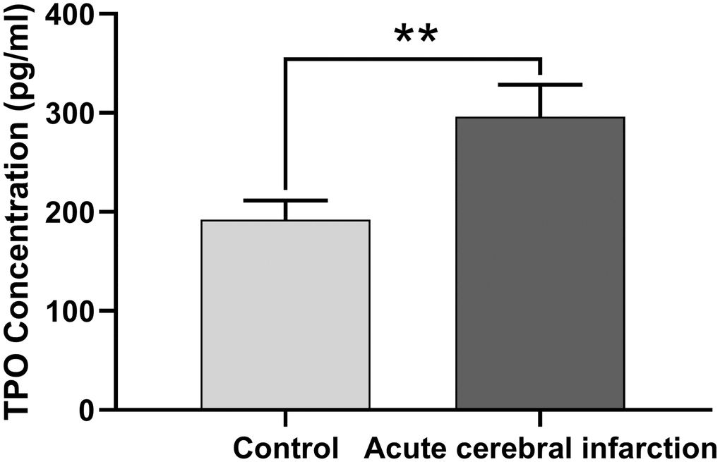 Next, we determined whether TPO levels were different in patients with acute cerebral infarction compared with controls. Patients with acute cerebral infarction (n = 16) had significantly higher levels of serum TPO (296.22 ± 32.32 pg/mL) compared to the control group (n = 45; 192.26 ± 19.40 pg/mL, P < 0.01, Figure 2); however, there were no significant changes in blood cell count (Table 2).