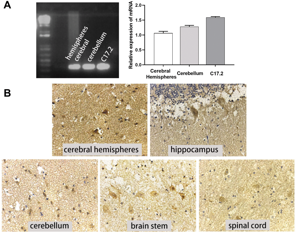 c-Mpl is a major receptor that mediates the response to TPO; thus, we also measured c-Mpl expression in human CNS tissues and cell lines. c-Mpl mRNA expression was found in human cerebral hemispheres, cerebellum, and C17.2 cells (Figure 3A). More importantly, we detected c-Mpl protein expression in neurons in human cerebral hemispheres, hippocampus, cerebellum, brain stem, and spinal cord (Figure 3B). Hippocampal neurons had the highest levels of c-Mpl protein.