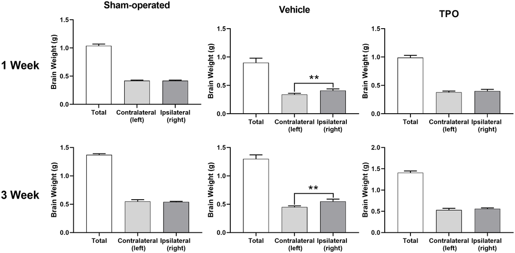 Brain injury was estimated using the percentage of weight reduction in the ipsilateral cerebral hemisphere compared to the contralateral hemisphere. At both assessment time points (1 and 3 weeks after hypoxic-ischemic treatment), the weights of the ipsilateral hemisphere (hypoxic-ischemia side) of the vehicle group decreased significantly compared with those in the sham group (Figure 4). Pups treated with TPO for 9 or 16 days had significantly higher weights in the ipsilateral hemisphere compared with those in the vehicle group (P < 0.05). Similar effects were observed in total brain weight at 3 weeks after surgery (P < 0.05). The contralateral brain weights of all groups were similar at both time points. The neuroprotective effect of TPO was consistent at these two time points when brain damage was determined by the reduced weight of the ipsilateral hemisphere compared with the contralateral hemisphere (P < 0.01, TPO vs vehicle group).