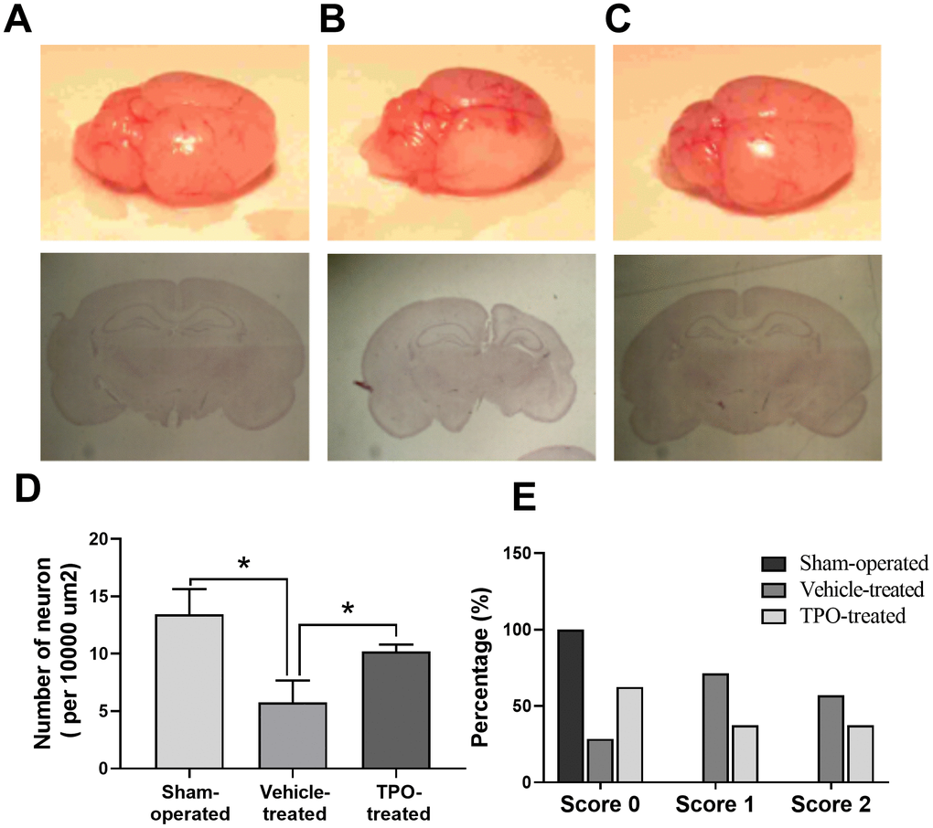 Next, we examined brain morphology at 3 weeks after surgery. Vehicle-treated animals displayed severe atrophy in the ipsilateral hemisphere (Figure 5B). In contrast, TPO treatment reversed the ipsilateral atrophy, as determined by the morphology of the right hemisphere, which was similar to that of the sham-operated control (Figure 5C). Neuron-specific enolase (NSE) staining of coronal sections also showed that vehicle-treated hypoxic-ischemic pups suffered from gross deformation and severe neuronal loss in the ipsilateral hemisphere, especially in the outer layer of the cerebral cortex (Figure 5A, 5B, 5D). In contrast, treatment with TPO decreased brain injury and improved neuronal damage (Figure 5C, 5D). The hemispheric structure of the TPO-treated group remained intact despite a slight reduction in size compared to the sham-operated pups (Figure 5C).