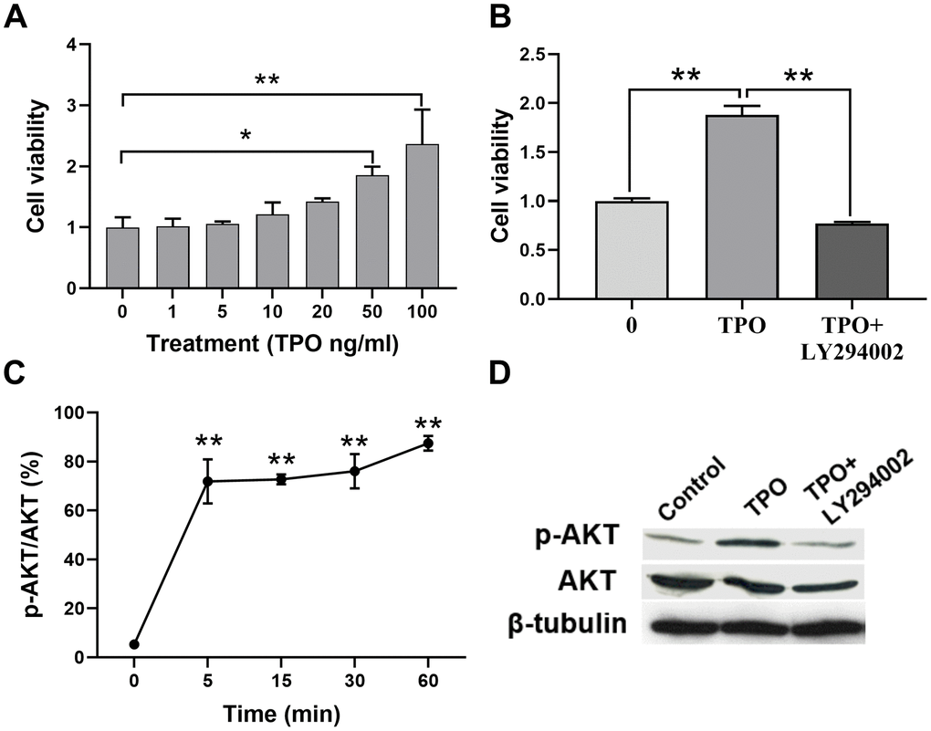 C17.2 cells were seeded onto 96-well culture plates at 5000 cells per well. After being cultured in IMDM with 10% FCS overnight, the cells were washed twice with PBS and then incubated without serum [21, 46]. Escalating doses of TPO (Pepro Tech, Rocky Hill, NJ; 0, 1, 10, 50, 100, and 200 ng/mL) were added to each well and incubated for 72 hours. C17.2 cells were pretreated with 50 μM of LY294002 (Calbiochem, Darmstadt, Germany), followed by 100 ng/mL of TPO, and then incubated for 72 hours. For the MTT proliferative activity assay, cells were incubated with 3-(4,5-dimethylthiazol-2-yl)-2,5-diphenyl tetrazolium bromide (MTT; Sigma-Aldrich) for 4 h. After 4 h, the supernatant was discarded, and DMSO (200 μL) was added to each well. The suspension was placed on a microvibrator for 5 min, and the absorbance (A) was measured at 570 nm with a microplate spectrophotometer (μ-Quant Microplate Spectrophotometer; BioTek Instruments). Cell viability was calculated using the following formula: