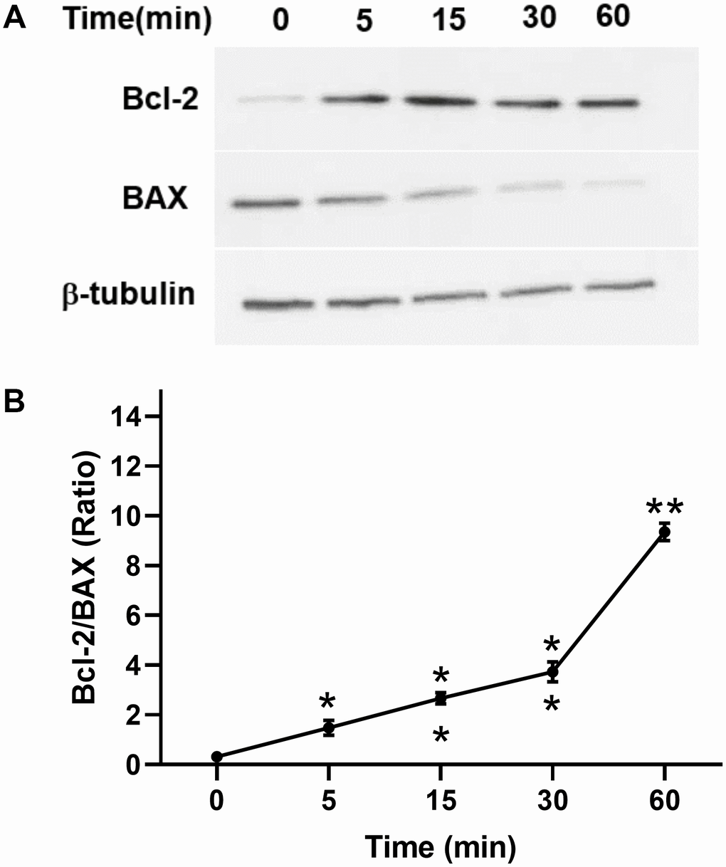 In addition, we investigated the antiapoptotic effect of TPO on C17.2 cells. Annexin V assays showed that TPO treatment (50 ng/mL) reduced the percentage of cell deaths (annexin V+/PI+) and apoptotic cells (annexin V+/PI–) (P < 0.05) in serum-free culture conditions (Table 3). These results indicate that TPO promotes survival of C17.2 cells. TPO treatment consistently led to increased levels of Bcl-2 and decreased levels of BAX in a time-dependent manner (0, 5, 15, 30, and 60 mins) in C17.2 cells cultured in serum-free media (Figure 7A, 7B), which indicates that the antiapoptotic effects of TPO on neural cells may be related to Bcl-2/BAX.