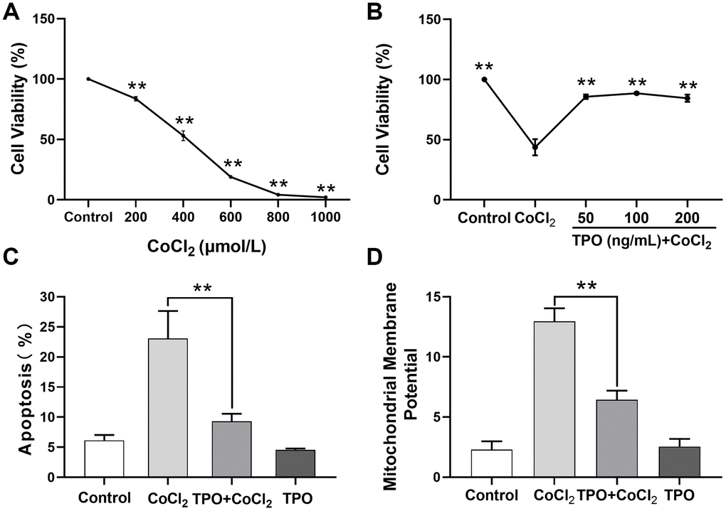 Next, we determined the ability of TPO to protect against CoCl2-induced cell injury in PC12 cell lines. The 24-hour survival rate of PC12 cells decreased significantly in a dose-dependent manner (Figure 8A).