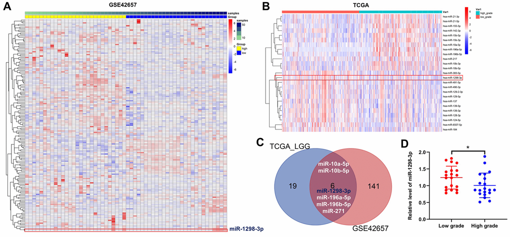 Raw data from GSE42657 were downloaded from the GEO database and subjected to differential expression analysis using the LIMMA package. In addition, glioma miRNAs expression dataset was downloaded from the TCGA database, and miRNA profile was analyzed using the LIMMA package for LGG and HGG. A total of 147 DEMs were identified in the GSE42657 dataset (Figure 1A), and 25 DEMs were identified in the TCGA dataset (Figure 1B). Using a Venn diagram, 6 overlapping DEMs were identified in the GSE42657 and TCGA datasets (Figure 1C). In addition, RT-qPCR results indicated that obviously decreased expression of miR-1298-3p was observed in the high-grade gliomas group (Figure 1D).
