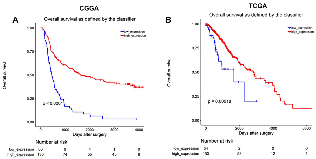 Next, we analyzed the correlation between the five identified overlapping DEMs and glioma prognosis. Low levels of miR-1298-3p correlated with decreased overall survival rates in glioma patients in the CGGA dataset (Figure 2A). In addition, low levels of miR-1298-3p correlated with poor overall survival rates in glioma patients in the TCGA dataset (Figure 2B). These data indicate that the low miR-1298-3p expression is associated with a poor survival in glioma patients.