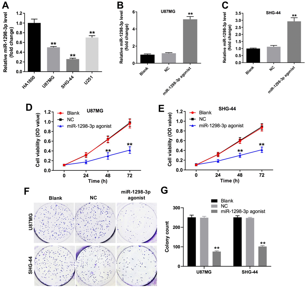 To investigate the role of miR-1298-3p in glioma cells, we analyzed miR-1298-3p levels in one human cortical astrocytes cell line HA1800, and three glioblastoma cell lines U87MG, SHG-44, and U251, by using RT-qPCR. As shown in Figure 3A, the level of miR-1298-3p was significantly downregulated in U87MG, SHG-44, and U251 cells, compared with HA1800 cells. Since the glioma cell lines U87MG and SHG-44 exhibited the lowest levels of miR-1298-3p, we used them in the next experiments. In addition, the level of miR-1298-3p had no obvious change in human neurons and human microglia groups, compared with HA1800 group (Supplementary Figure 1A). As shown in Figure 3B, 3C, the level of miR-1298-3p was upregulated in U87MG and SHG-44 cells after transfection with miR-1298-3p agonist. Meanwhile, overexpression of miR-1298-3p significantly reduced proliferation of U87MG and SHG-44 cells (Figure 3D–3G). Furthermore, downregulation of miR-1298-3p exhibited a slight increase in the cell proliferation of U251 cells, while overexpression of miR-1298-3p exhibited a significant decrease in the cell proliferation of U251 cells (Supplementary Figure 1B). These data suggested that overexpression of miR-1298-3p inhibits proliferation of glioma cells.