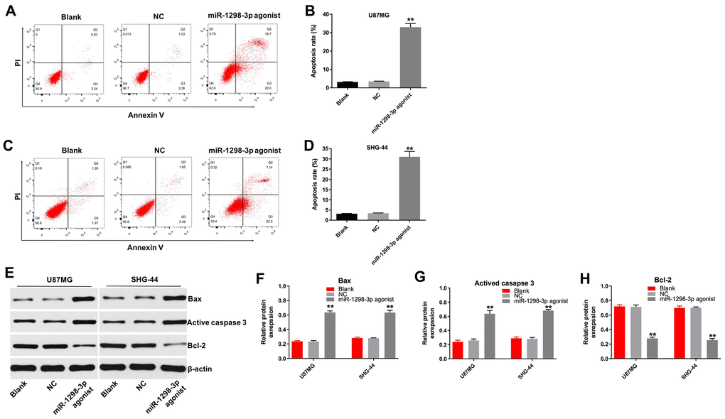 The role of miR-1298-3p in the regulation of apoptosis in glioma cells was analyzed by using flow cytometry. As illustrated in Figure 4A–4D, miR-1298-3p agonist markedly induced apoptosis in U87MG and SHG-44 cells. In addition, levels of the pro-apoptotic protein Bax and active caspase 3 were increased, and levels of the anti-apoptotic protein Bcl-2 were decreased in U87MG and SHG-44 cells transfected with miR-1298-3p agonist, compared with NC group (Figure 4E–4H). Moreover, overexpression of miR-1298-3p markedly induced apoptosis in U251 cells as well, while downregulation of miR-1298-3p slightly increased apoptosis of U251 cells (Supplementary Figure 1C, 1D). These data indicate that overexpression of miR-1298-3p induces apoptosis of glioma cells.
