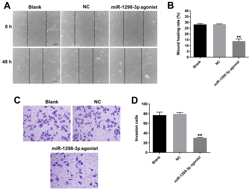 U87MG cells were seeded at a density of 5×105 cells into a 12-well culture plate overnight at 37 °C. At 80% confluence, a wound area was made in the cell monolayer with a 20 μL pipette tip. Subsequently, the cells were washed with PBS and cultured with fresh FBS free medium at 37°C. Then, cells were transfected with 10 nM miR-1298-3p agonist for 48 h at 37°C. The width of the wound area was photographed at 0 h and 48 h using a fluorescence microscope (Olympus), and cell migration was quantified using ImageJ software.