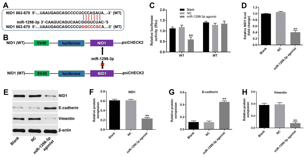 To identify the target genes of miR-1298-3p, we used the online bioinformatics tools TargetScan (http://www.targetscan.org/vert_71/) and miRDB (http://www.mirdb.org). As shown in Figure 6A, Nidogen-1 (NID1) was identified as a potential target of miR-1298-3p. To validate that NID1 is indeed a target of miR-1298-3p, we used a dual-luciferase reporter assay. As shown in Figure 6B, 6C, miR-1298-3p agonist suppressed the luciferase activity of NID1-WT, but it did not affect the luciferase activity of NID1-MT. Overexpression of miR-1298-3p significantly decreased the NID1 gene expression in U87MG cells (Figure 6D). In addition, miR-1298-3p agonist markedly decreased the protein levels of NID1 and vimentin, but increased the protein level of E-cadherin in U87MG cells, compared with NC group (Figure 6E–6H). These data indicate that NID1 is a direct target of miR-1298-3p.