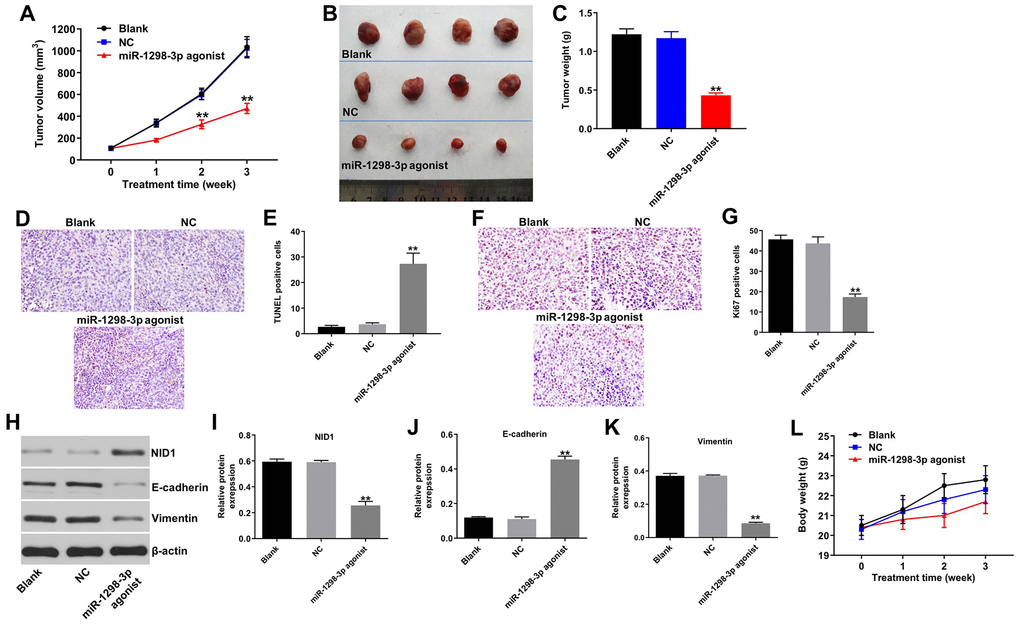 To explore the role of miR-1298-3p in regulating the glioma tumor growth in vivo, U87MG and U251 subcutaneous xenograft models were established. As shown in Figure 7A–7C and Supplementary Figure 2A–2C, miR-1298-3p agonist treatment significantly inhibited the tumor volume and tumor weight of U87MG or U251 subcutaneous xenografts, compared with NC group. In addition, TUNEL assay showed that overexpression of miR-1298-3p markedly induced apoptosis in tumor tissues, compared with the NC group (Figure 7D, 7E). Moreover, IHC assay indicated that overexpression of miR-1298-3p notably inhibited proliferation in tumor tissues, compared with the NC group (Figure 7F, 7G). Meanwhile, miR-1298-3p agonist markedly decreased the protein levels of NID1 and vimentin, but increased the protein level of E-cadherin in tumor tissues, compared with NC group (Figure 7H–7K). Furthermore, the body weights of mice had no obvious change between miR-1298-3p agonist group and NC group, indicating that miR-1298-3p had no system toxicity on mice (Figure 7L and Supplementary Figure 2D). These data show that upregulation of miR-1298-3p inhibits the glioma tumorigenesis in vivo.