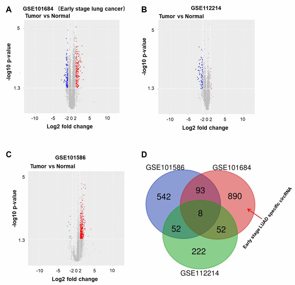 To detect differentially expressed circRNAs in NSCLC, we performed a bioinformatics analysis. In Figure 1A–1C, circRNAs differentially expressed as compared to normal tissues in the GSE101586, GSE101586 and GSE112214 datasets are presented as volcano plots. Overlap among the three datasets is illustrated by the Venn diagram in Figure 1D. Among the differentially expressed circRNAs, 890 in GSE101684 were related to early stage NSCLC.
