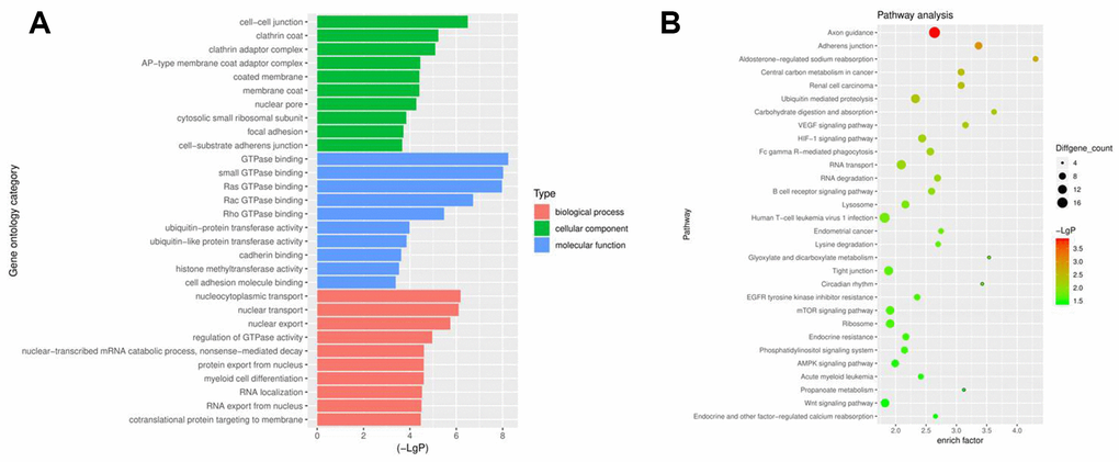 Gene ontology (Go) and pathway analyses performed to determine the host genes of the circRNAs showed that the most common biological process was nucleocytoplasmic transport. The most enriched cellular component was cell-cell junction, and the most enriched molecular function was GTPase binding (Figure 2A). Pathway analysis revealed that the phosphatidylinositol 3 kinase (PI3K) signaling pathway was related to the development of NSCLC (Figure 2B).