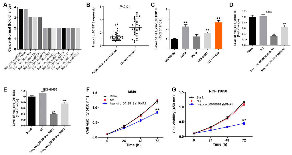 The top differentially expressed circRNAs in GSE101684 were related to early stage NSCLC (Figure 3A). Among them, hsa_circ_0018818 (host gene: USP54) closely correlated with NSCLC tumorigenesis. Therefore, hsa_circ_0018818 was selected for further analysis. In addition, hsa_circ_0018818 was significantly upregulated in NSCLC tissues compared with adjacent normal tissues (Figure 3B). Besides, hsa_circ_0018818 was closely associated with the metastasis of NSLC (Table 1). RT-qPCR analysis showed that hsa_circ_0018818 expression was upregulated in several NSCLC cell lines as compared to BEAS-2B normal lung epithelial cells (Figure 3C). Further analysis of A549 and NCI-H1650 cells showed that transfecting the cells with shRNA1 or shRNA2 targeting hsa_circ_0018818 significantly downregulated its expression (Figure 3D, 3E). Although both shRNAs were stably transfected, hsa_circ_0018818 shRNA1 exhibited better transfection efficiency and was therefore used in subsequent experiments. CCK-8 assays demonstrated that silencing of hsa_circ_000018818 significantly inhibited NSCLC cell proliferation (Figure 3F, 3G).