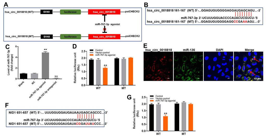 To determine the target of miR-767-3p, Targetscan (http://www.targetscan.org/vert_71/), miRDB (http://www.mirdb.org/), and dual luciferase assays were used. As illustrated in Figure 5F, 5G, NID1 is a direct target of miR-767-3p.