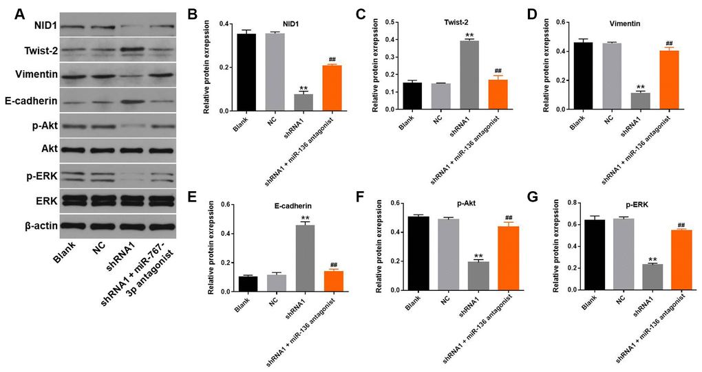 Subsequent western blot analysis demonstrated that hsa_circ_0018818 knockdown significantly decreased expression of NID1 (Figure 6A, 6B). This inhibitory effect of hsa_circ_0018818 shRNA1 on NID1 was partially reversed by miR-767-3p antagonist (Figure 6B). Moreover, expression of Twist-2 and E-cadherin in NSCLC cells was notably increased by knockdown of hsa_circ_0018818. In contrast, hsa_circ_0018818 shRNA1 greatly decreased the expression of Vimentin. Meanwhile, downregulation of miR-136 partially suppressed the inhibitory effect of hsa_circ_0018818 shRNA on EMT process of NSCLC (Figure 6A, 6C–6E). Besides, expression of p-Akt and p-ERK in NSCLC cells was significantly downregulated by hsa_circ_0018818 knockdown, but was partially rescued in the presence of miR-767-3p antagonist (Figure 6A, 6F, 6G). This suggests that hsa_circ_0018818 silencing inhibits the progression of NSCLC by inactivating EMT process and PI3K/Akt signaling.