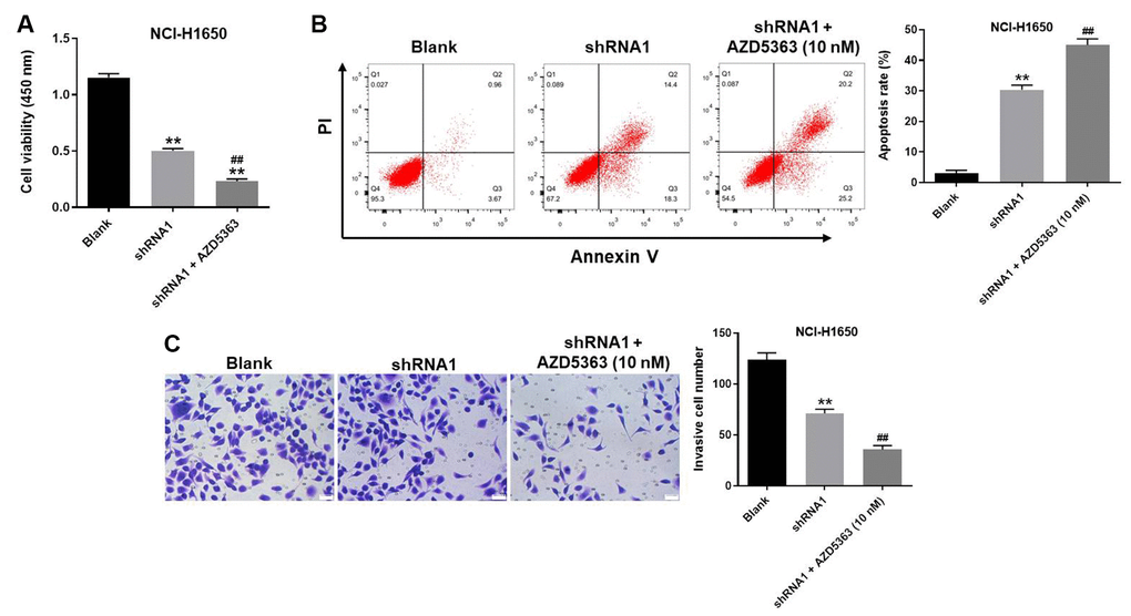 To further verify the mechanism by which hsa_circ_0018818 mediated the progression of NSCLC, CCK-8 assay was performed. The data confirmed that anti-proliferative effect of hsa_circ_0018818 shRNA on NSCLC was further increased in the presence of AZD5363 (Figure 7A). Consistently, AZD5363 enhanced the apoptotic effect of hsa_circ_0018818 shRNA (Figure 7B). Moreover, the inhibitory effect of hsa_circ_0018818 shRNA on cell invasion was enhanced by AZD5363 as well (Figure 7C). To sum up, Akt inhibitor further enhanced the inhibitory effect of hsa_circ_0018818 shRNA on progression of NSCLC.