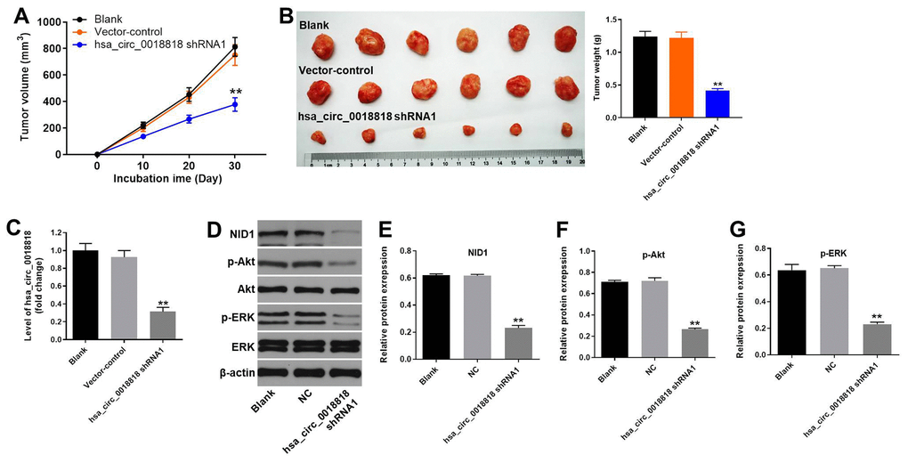 Finally, a xenograft mouse model was established to detect the function of hsa_circ_0018818 in NSCLC in vivo. Four weeks after subcutaneous injection of NC1-H1650 cells, tumor size and weight were significantly lower when cells were transfected hsa_circ_0018818 shRNA1 prior to injection (Figure 8A, 8B). RT-qPCR confirmed that hsa_circ_0018818 levels were stably suppressed within the tumor tissue (Figure 8C). In addition, western blotting revealed that expression levels of NID1, p-Akt and p-ERK were all significantly reduced in tumor tissues expressing hsa_circ_0018818 shRNA1 (Figure 8D–8G). These results demonstrate that downregulating hsa_circ_0018818 significantly attenuates NSCLC tumorigenesis in vivo.