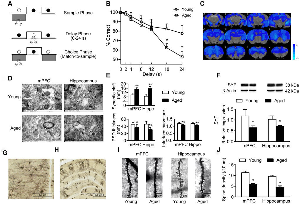 In addition, there were significant changes of synaptic structures in medial prefrontal cortex (mPFC) and hippocampus in aged rats, including widened synaptic cleft, thinned post-synaptic density (PSD), and decreased curvature of synaptic interface (Figure 1D–1E). Aged rats had a decreased expression of synaptophysin in mPFC and hippocampus compared to young rats (P < 0.05, Figure 1F). Furthermore, the density of dendritic spines in mPFC and hippocampus decreased significantly in aged rats (Figure 1G–1J).
