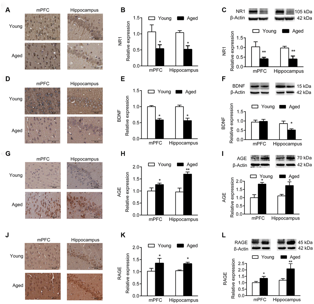 Immunohistochemistry (IHC) and western blotting analyses demonstrated that the expression of NR1, the essential subunit of N-methyl-D-aspartate (NMDA) receptor, decreased significantly in aged mPFC and hippocampus compared with young rats (Figure 2A–2C). In addition, the expression of brain derived neurotrophic factor (BDNF) in mPFC and hippocampus of aged rats decreased compared with young rats (Figure 2D–2F), while the expression of advanced glycation end products (AGEs) and receptor for AGEs (RAGE) increased (Figure 2G–2L).