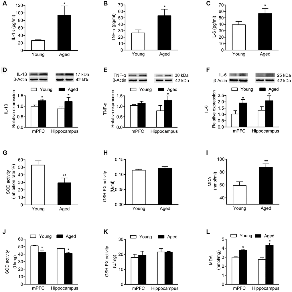 We then examined activity of the antioxidant enzymes superoxide dismutase (SOD) and glutathione peroxidase (GSH-PX), as well as the expression of malondialdehyde (MDA). In serum, the SOD activity of aged rats declined, while the MDA expression increased; the activity of GSH-PX did not change compared to young rats (Figure 3G–3I). Similarly, both in mPFC and hippocampus of aged rats, the SOD activity declined, while the MDA level increased compared with young rats; the activity of GSH-PX did not change (Figure 3J–3L).