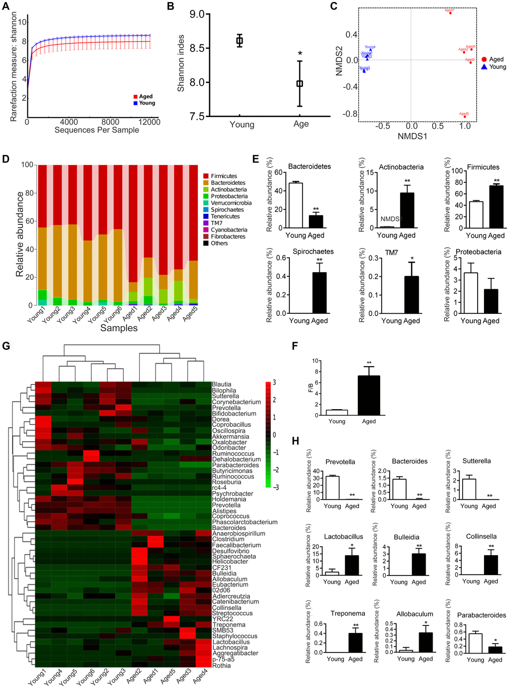 We then analyzed the composition of microbiota communities at various taxonomic levels. At the phylum level, Bacteroidetes and Firmicute were the main bacteria in the feces of rats (Figure 4D). The relative abundance of Bacteroidetes was lower in aged rats than in young rats, while the relative abundance of Firmicutes was higher (Figure 4E). The ratio of Firmicutes / Bacteroidetes (F/B) increased about 7.4 fold with aging, from 0.97 ± 0.07 to 7.22 ± 1.69 (P < 0.01, Figure 4F). In addition, the relative abundance of Actinobacteria, Spirochaetes and TM7 increased in aged rats compared to young rats (Figure 4E). There was no statistical difference in Proteobacteria between the young and aged rats (Figure 4E).