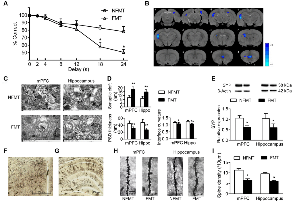 To evaluate the alterations of neuronal structures induced by FMT, we analyzed the effect of FMT on synaptic structures, synaptophysin expression, and density of dendritic spines in mPFC and hippocampus. Compared with NFMT rats, the synaptic structures of FMT rats were significantly changed and similar to the structural characteristics of aged rats, including widened synaptic cleft (mPFC: 18.82 ± 2.30 vs 9.92 ± 1.97, P < 0.01; hippocampus: 15.87 ± 2.30 vs 8.99 ± 2.00, P < 0.01), decrease in the thickness of post-synaptic density (mPFC: 30.79 ± 4.49 vs 44.84 ± 7.58, P < 0.01; hippocampus: 26.41 ± 5.21 vs 47.76 ± 8.85, P < 0.01), as well as a decrease in the curvature of synaptic interface (mPFC: 1.08 ± 0.09 vs 1.17 ± 0.06, P < 0.05; hippocampus: 1.07 ± 0.04 vs 1.23 ± 0.09, P < 0.01, Figure 6C, 6D). In addition, the expression of synaptophysin in mPFC and hippocampus of FMT rats was decreased compared with NFMT rats (P < 0.05, Figure 6E). In mPFC and hippocampus, the dendritic spines of FMT rats decreased significantly compared with NFMT rats (P < 0.05, Figure 6F–6I).